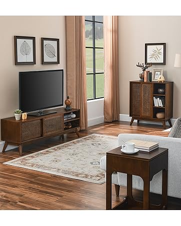 LKTART Mid Century Modern Storage Cabinet with Rattan Sliding Doors and Open Shelves, Boho Style Wooden Sideboard Buffet for Living Room,Light Walnut